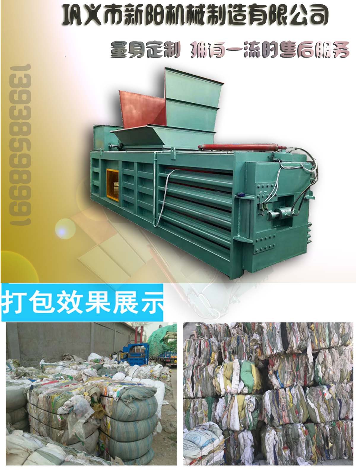我對廢紙打包機其實很有信心,因為,現如今社會的發展離不開高科技的設備,而廢紙打包機可以通過自身的優勢可以幫我們解決生活當中很多的難題,它可打包的東西特別多,衣服,廢紙,紙殼,紙箱,稻草,金屬,易拉罐,飲料瓶,薄膜等等,多的說不出來,這些都通過廢紙打包機來進行打包的,這款設備操作簡單,質優價廉;為了保證廢紙打包機的穩定牢固,可進行正確的安裝、調試以及培訓等系列工作,方可正常進行廢紙打包工作。